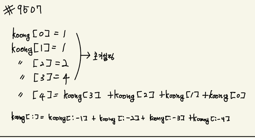 koong[i] = koong[i-1] + koong[i-2] + koong[i-3] + koong[i-4]