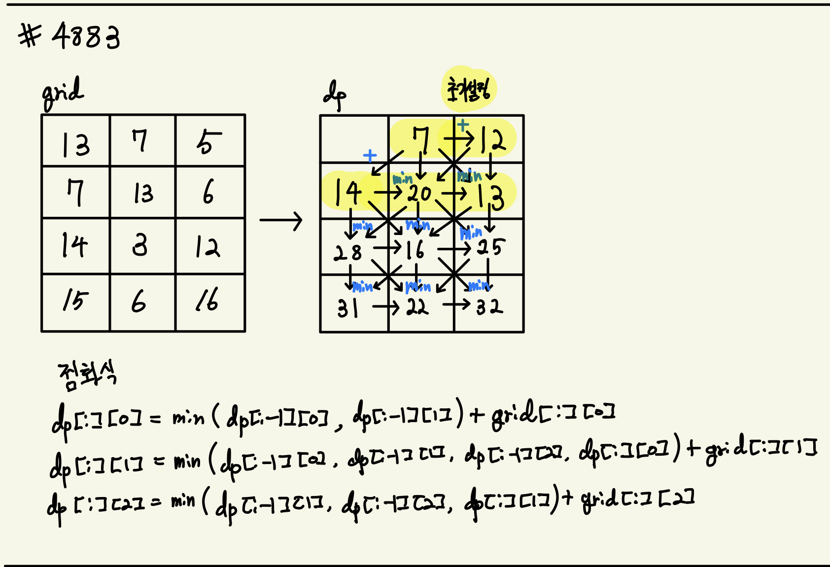 dp[1][1] = min(dp[0][1], dp[0][2], dp[1][0]) + grid[1][1]