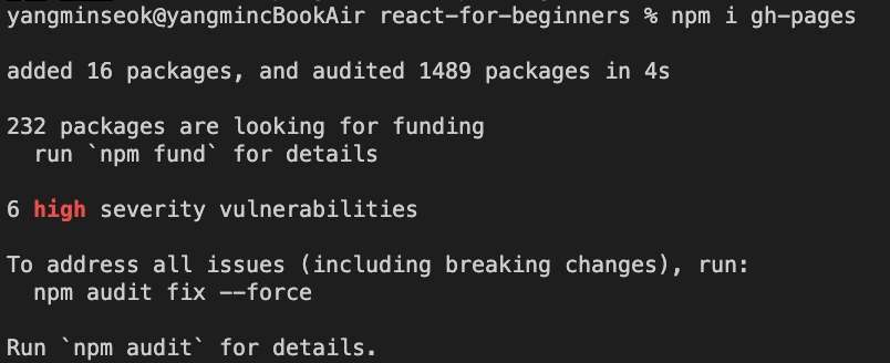 터미널을 열고 다음 코드를 실행시켜 리액트 내에 gh-pages를 설치해준다.