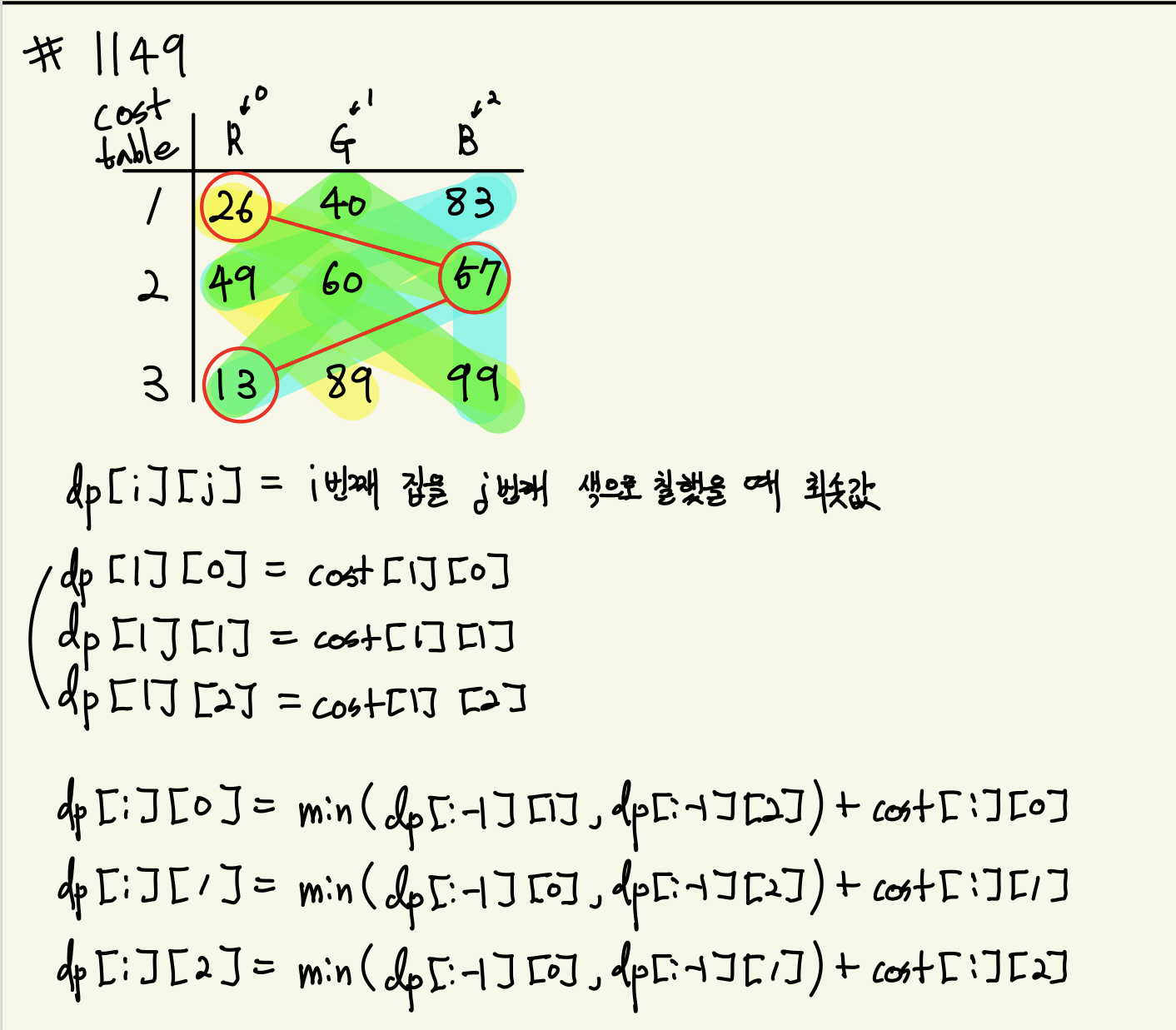 dp[i][0] = min(dp[i-1][1], dp[i-1][2]) + cost[i][0]