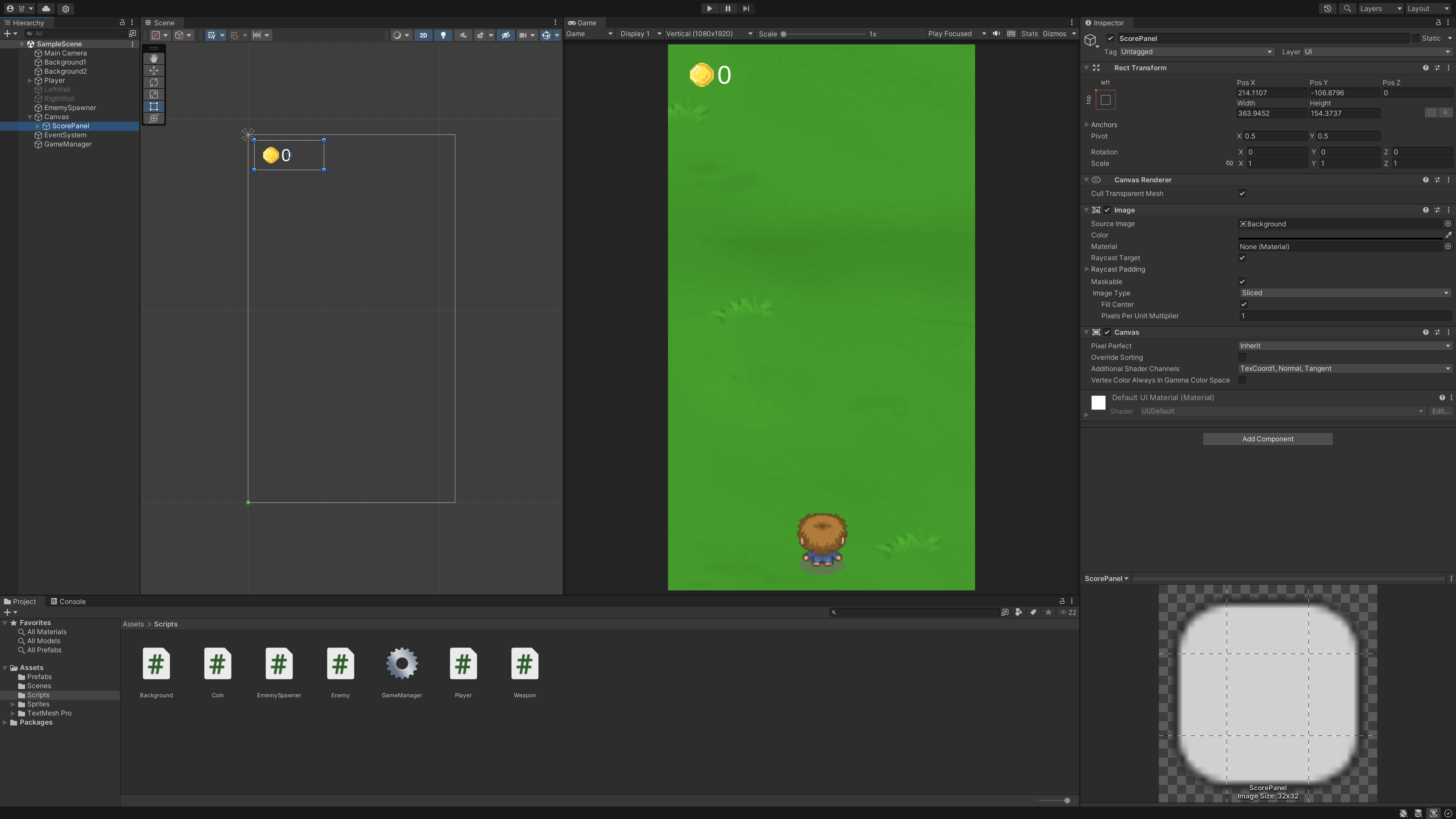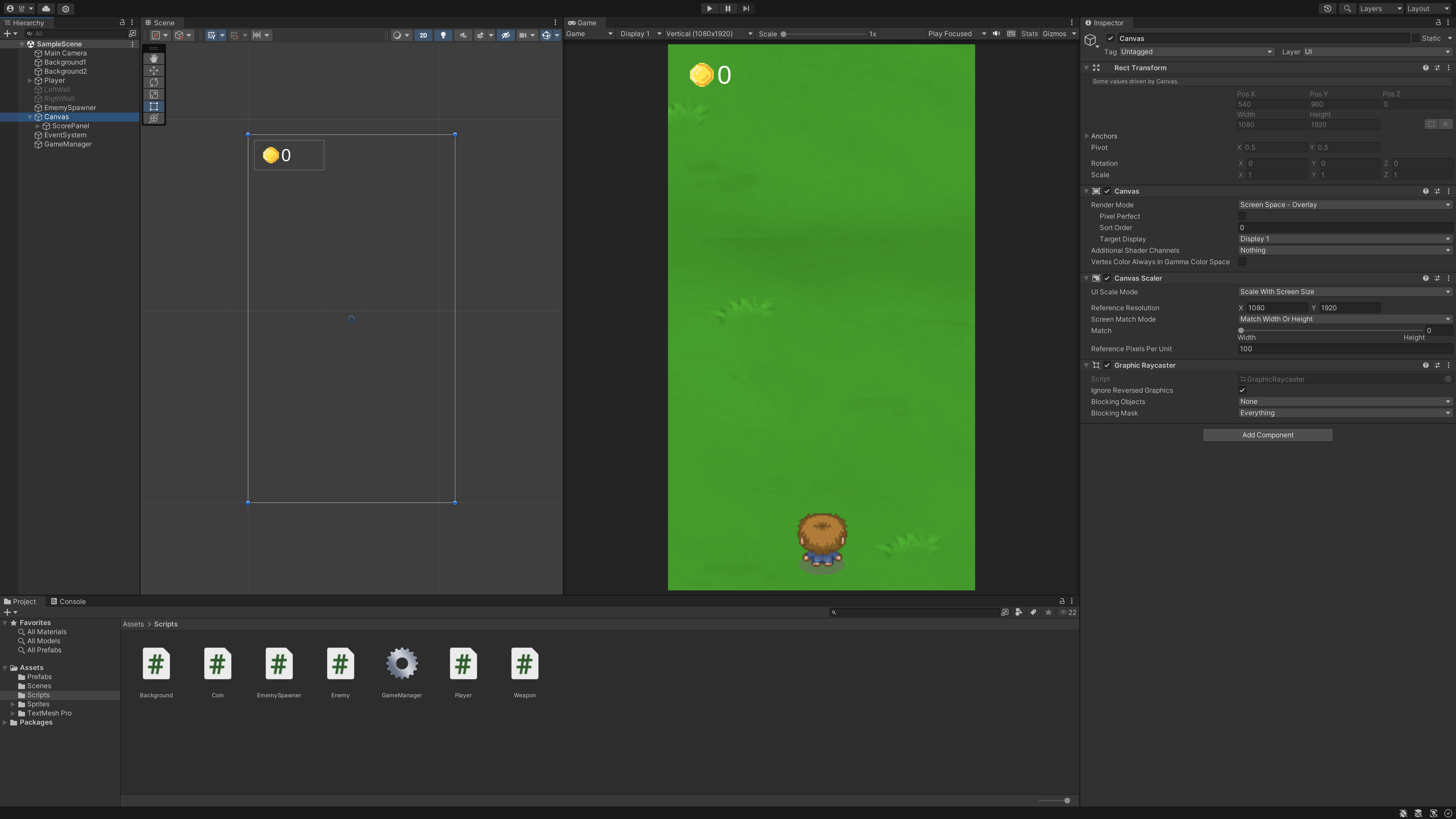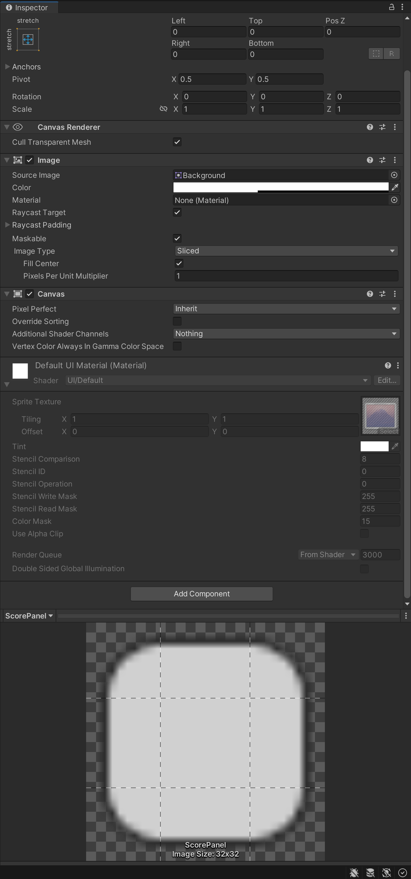 이유 : Canvas Scaler 컴포넌트는 가장 상위 객체에서만 나타남 (위 그림의 경우 ScorePanel이 아닌 Canvas에서만 나타남)