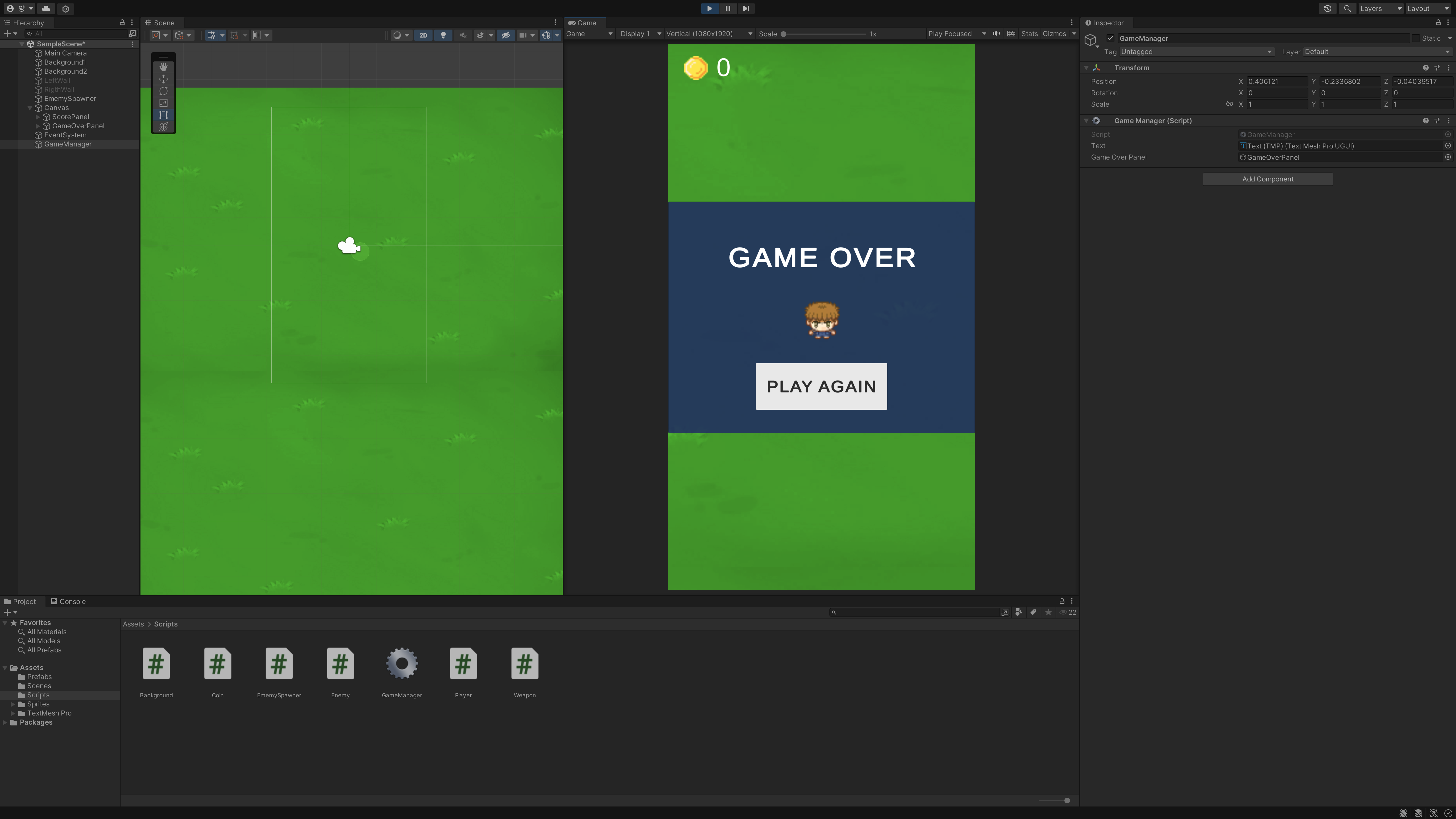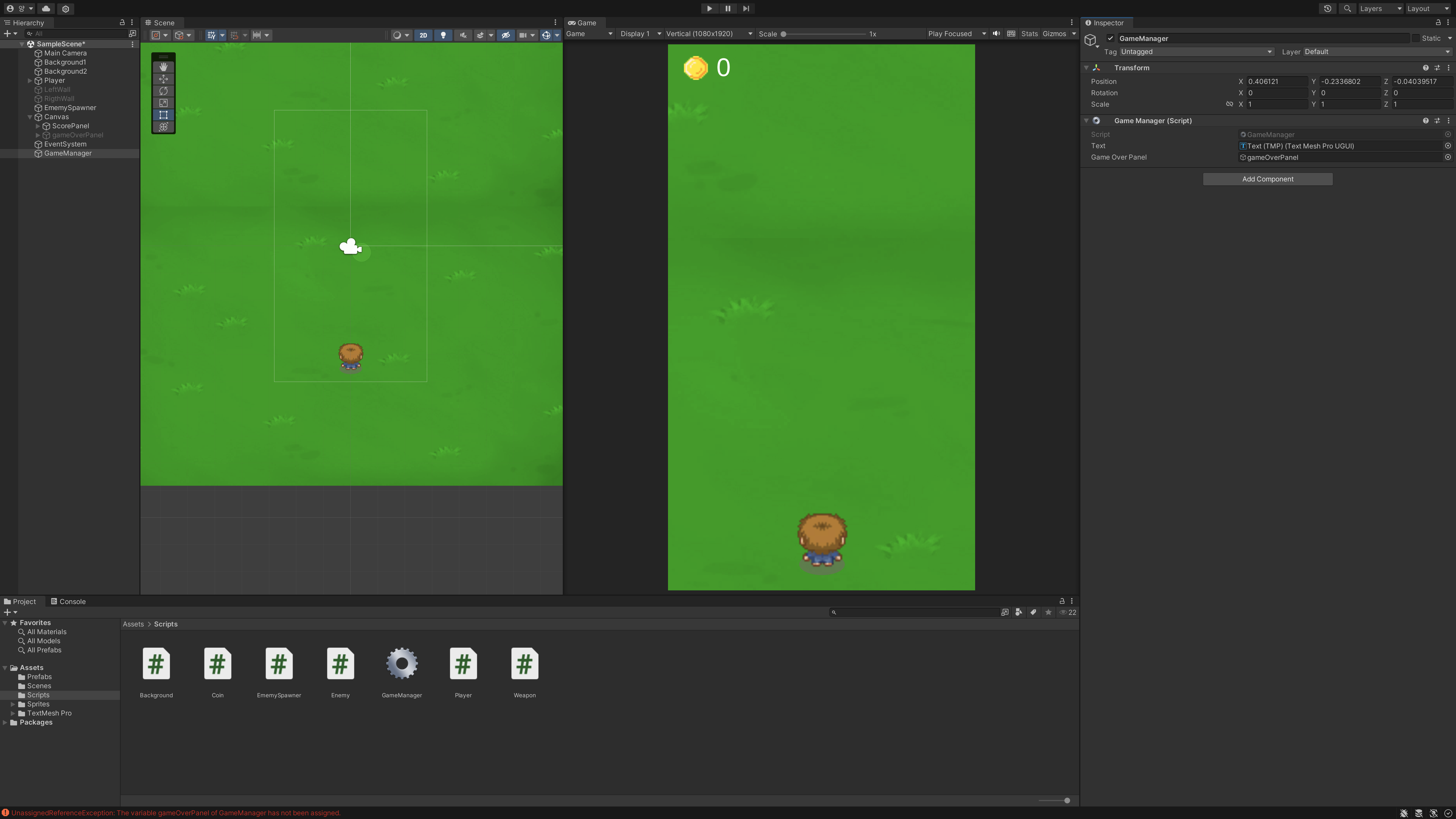 해결 방안 : gameOverPanel로 설정했던 객체 이름을 GameOverPanel로 변경